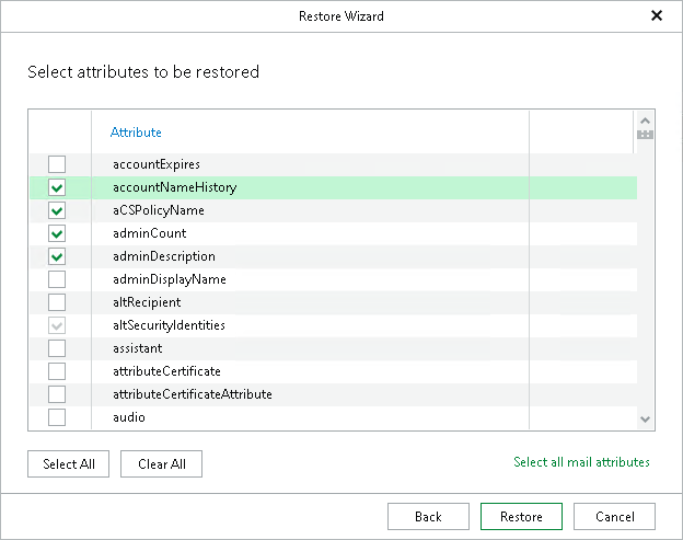 Step 7. Specify Attributes to Restore At this step of the wizard, select the necessary attributes and click Restore.This step is available only if you have chosen the Selected attributes only option at the previous step.