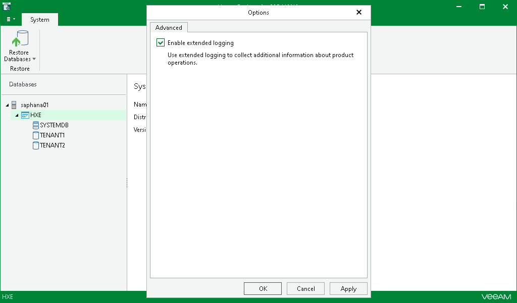 Veeam Explorer for SAP HANA allows you to enable an extended logging mode to collect more detailed logs on specific operations. After you enable extended logging, you can go back to the application and perform the actions for which you want to collect additional information. Then you can collect the logs. For more information on log collection, see Getting Support.