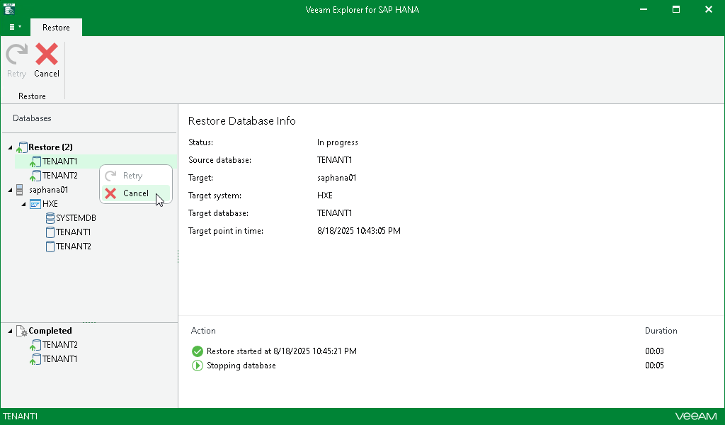If a database is successfully restored or its restore process is canceled, it moves to the Completed node in the bottom section of the navigation pane.