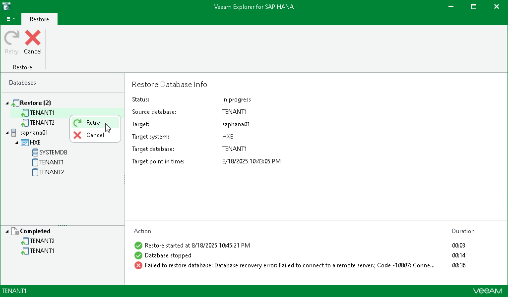 If anything disrupts the restore process (the target server crashes or the network is down), you can launch the retry manually after the server or network is up. You cannot manually launch retry of an ongoing restore session.