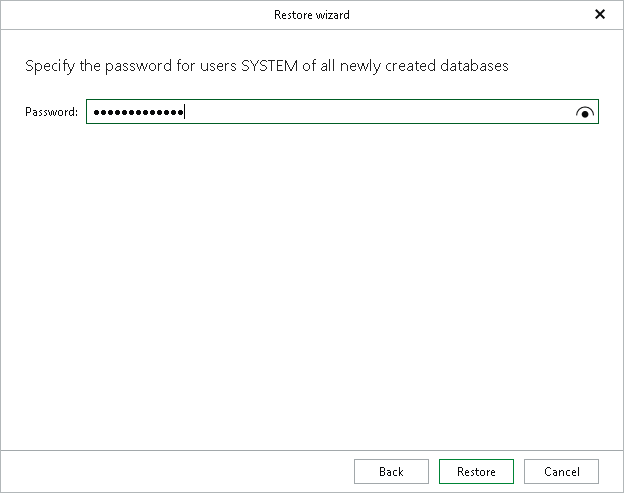 At this step, specify a password for this new SYSTEM user and click Restore.