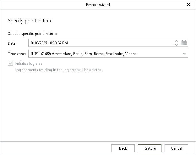 Each database will be restored to the most recent available state to the date and time selected in the Date field. Note that if any of the databases that you want to restore were first backed up after the specified point in time, their restore process will fail.