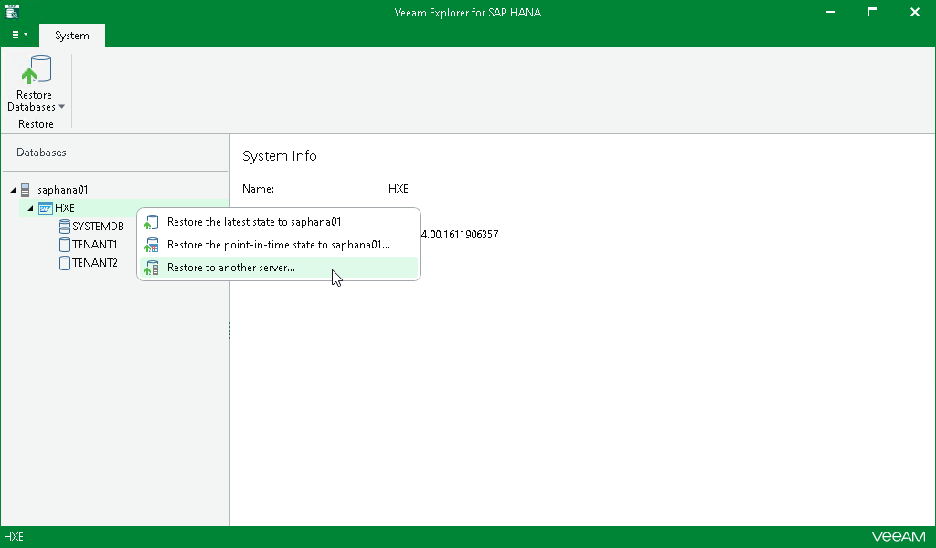 Step 1. Launch Restore Wizard To launch the Restore wizard, do the following:In the navigation pane, select the SAP HANA system.On the System tab, select Restore Database > Restore to another server.Alternatively, you can right-click the system and select Restore to another server.