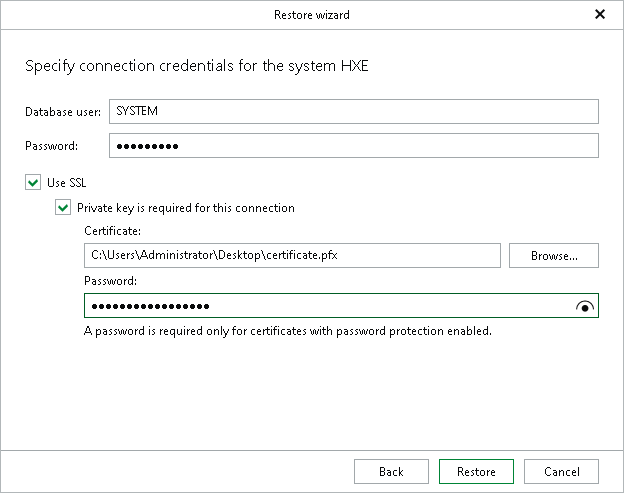 Note that before you restore a tenant database using SSL, you must have SAP Common Crypto Library installed on the backup server. For more information about how to install SAP Common Crypto Library on Windows machines, see the SAP Help Portal.