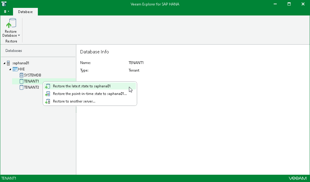 - On the Database tab, select Restore Database > Restore the latest state to <original_location>.