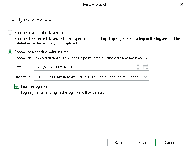 - Select the Initialize log area check box to remove all log segments in the log area or, in other words, to clear the part of the system memory that temporarily stores transaction logs before they are moved to the log backups. This allows you to restore the database to the latest available log backup before the selected point in time.