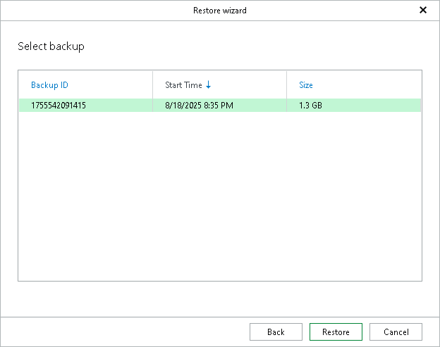 You can sort the available data backups by their backup IDs, the time they were created and by their size. Note that the displayed start time of the backups uses the time zone of the backup server.