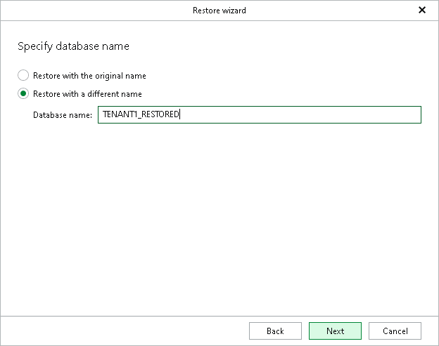 - Select Restore with a different name to change the name of the restored database on the target SAP HANA system.