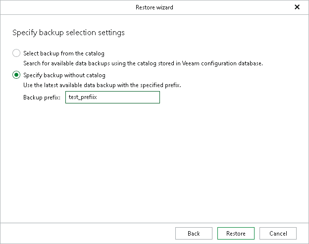 - The Specify backup without catalog option allows you to restore your database from a backup with the specified backup prefix. Use this option for backups created with the standalone Veeam Plug-In for SAP HANA. For more information, see Database Protection.