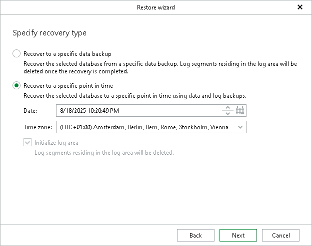 If you select the Recover to a specific data backup option, proceed to the next step of the wizard. If you select the Recover to a specific point in time option, click Restore.
