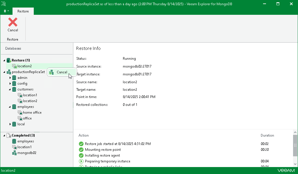 After you finish the steps of the Restore wizard, Veeam Explorer for MongoDB starts a restore session.