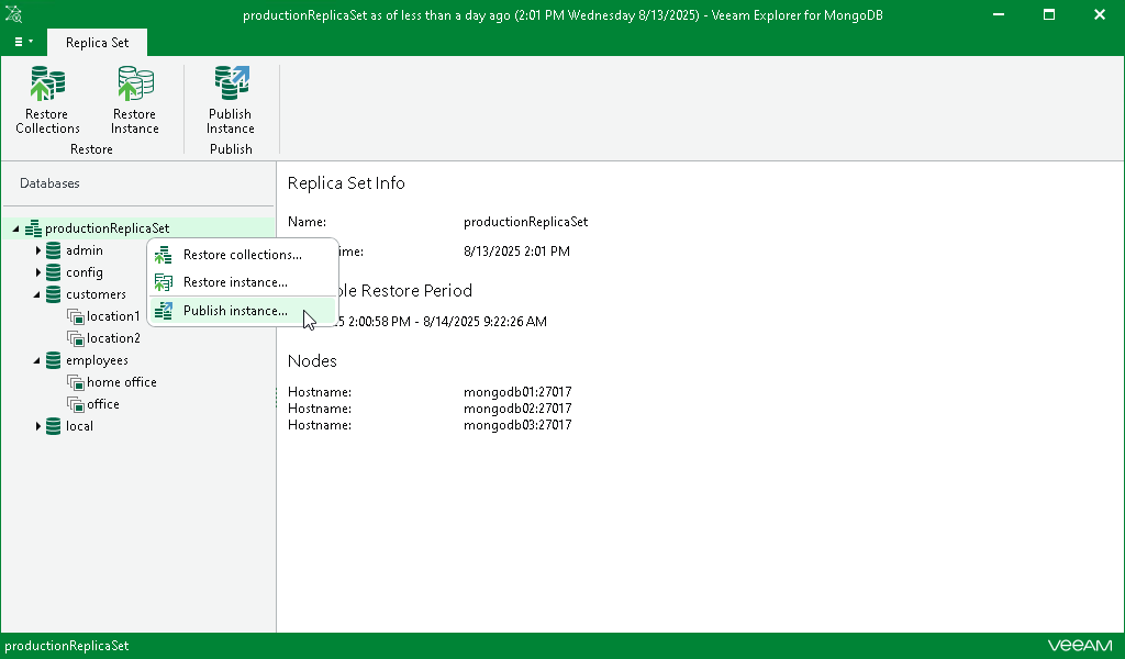 Step 1. Launch Publish Wizard To publish the MongoDB instance, do the following:In the navigation pane, select the replica set.On the Replica Set tab in the ribbon menu, select Publish Instance.Alternatively, you can right-click the replica set in the navigation pane and select Publish instance.