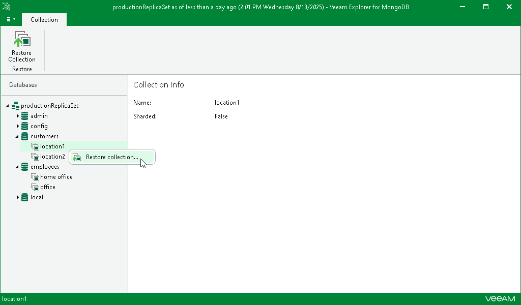 Step 1. Launch Restore Wizard To restore a collection, do the following:In the navigation pane, select a collection.On the Collection tab in the ribbon menu, select Restore Collection.Alternatively, you can right-click a collection in the navigation pane and select Restore collection.
