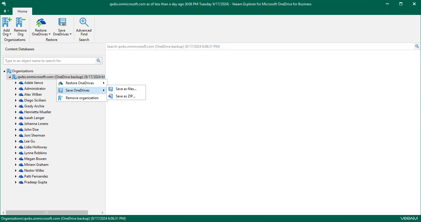 - Right-click an organization with OneDrives and select Save OneDrives > Save as files or Save OneDrives > Save as ZIP.