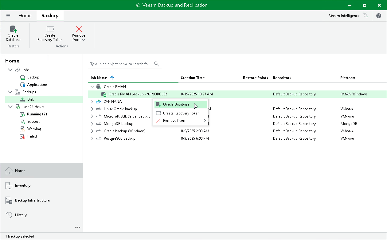 - Right-click an RMAN plug-in backup and select Oracle Database.