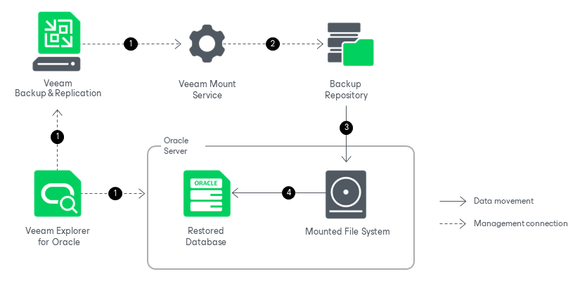 - Veeam Explorer for Oracle sends a restore command to the Veeam Mount Service running on the mount server associated with the backup repository. The service connects to the backup repository and prepares the mounting operation.