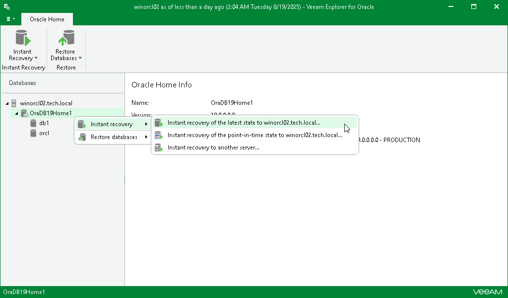 Alternatively, you can right-click the Oracle server or an Oracle home and select Instant Recovery > Instant recovery of the latest state to <original_location>.