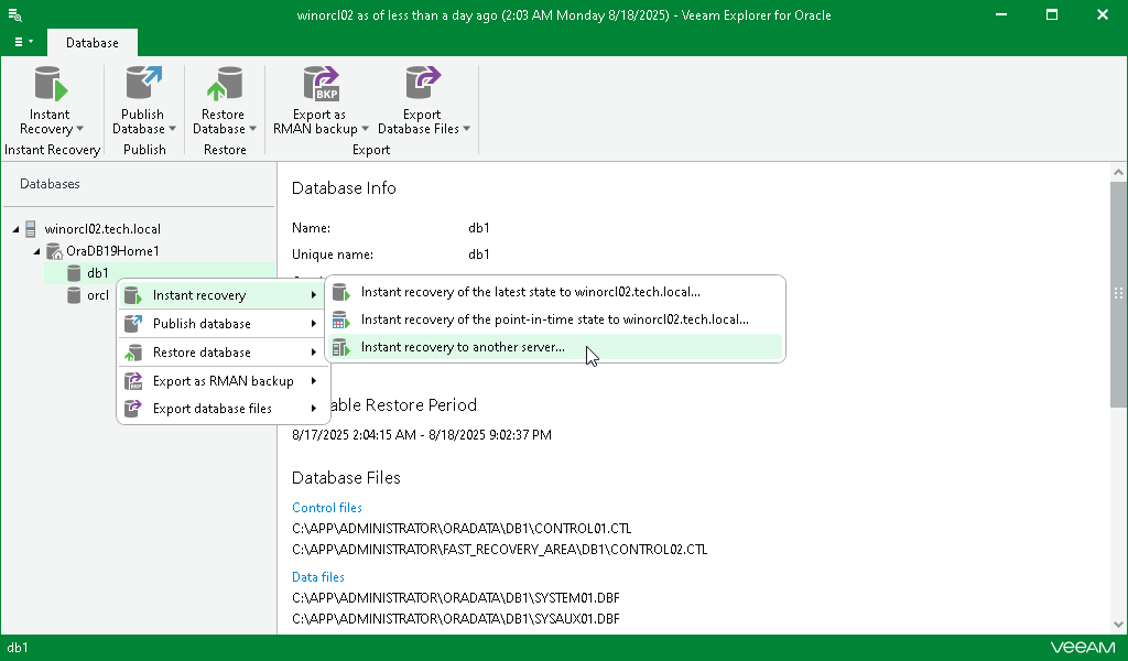 Step 1. Launch Instant Recovery Wizard To launch the Instant Recovery wizard, do the following:In the navigation pane, select a database.On the Database tab, select Instant Recovery > Instant Recovery to another server.Alternatively, you can right-click a database and select Instant recovery > Instant recovery to another server.