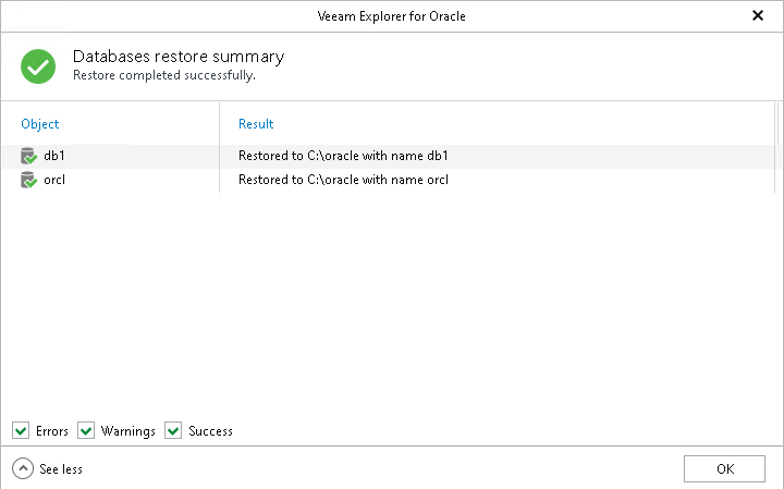 Step 5. Review Restore Summary At the Databases restore summary step, click See more to expand the window and review details of the restore operation.You can filter notifications by their status: Error, Warning or Success.