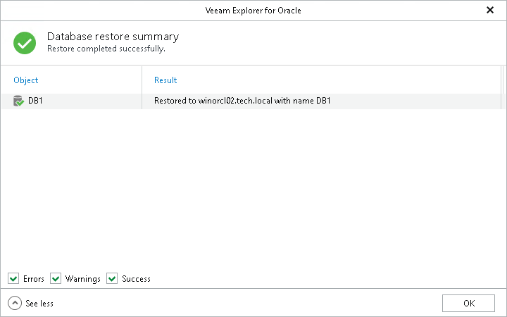Step 10. Review Restore Summary At the Database restore summary step, click See more to expand the window and review details of the restore operation.You can filter notifications by their status: Error, Warning or Success.
