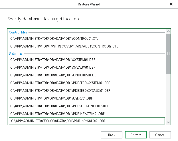 Step 6. Specify Database Files Location At this step of the wizard, specify the location for database files and click Restore.To edit the path, click the path row and provide the location you want to use.