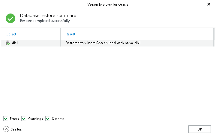 Step 7. Review Restore Summary At the Database restore summary step, click See more to expand the window and review details of the restore operation.You can filter notifications by their status: Error, Warning or Success.