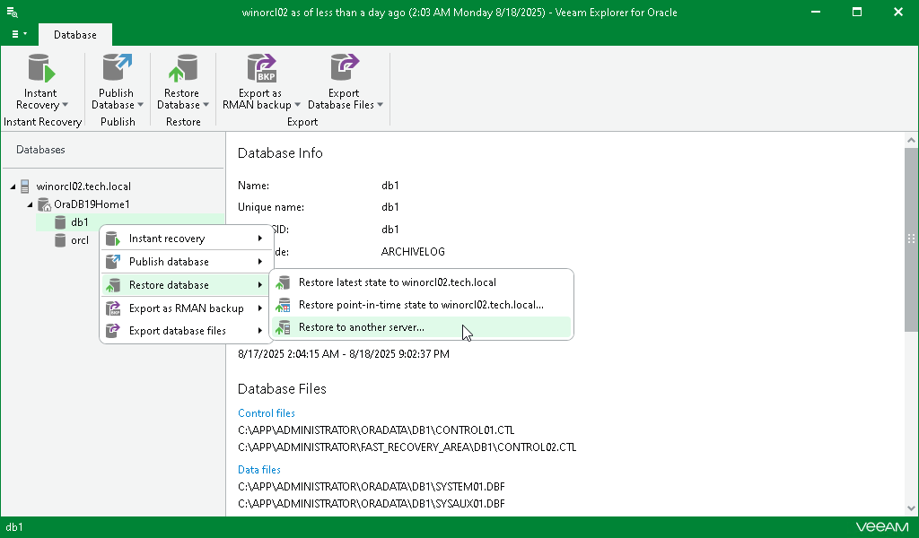 Step 1. Launch Restore Wizard To launch the Restore wizard, do the following:In the navigation pane, select a database.On the Database tab, select Restore Database > Restore to another server.Alternatively, you can right-click a database and select Restore database > Restore to another server.