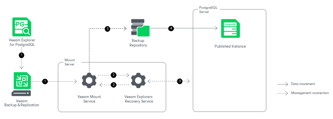 - To start the publishing process, Veeam Explorer for PostgreSQL sends a publishing command to the Veeam Mount Service. The service runs on the mount server associated with the backup repository.