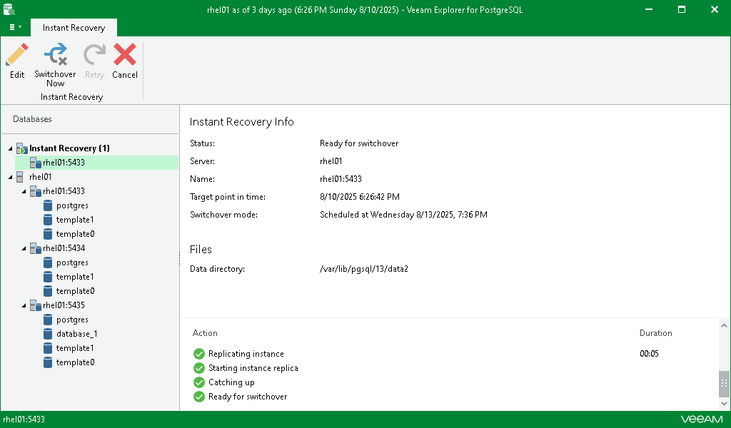 In the Instant Recovery session view, you can see the progress of the recovery, edit switchover settings, retry instant recovery and cancel instant recovery. For more information, see Managing Instant Recovery Session.
