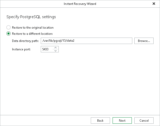 - Specify a location to which you want to restore the PostgreSQL instance: