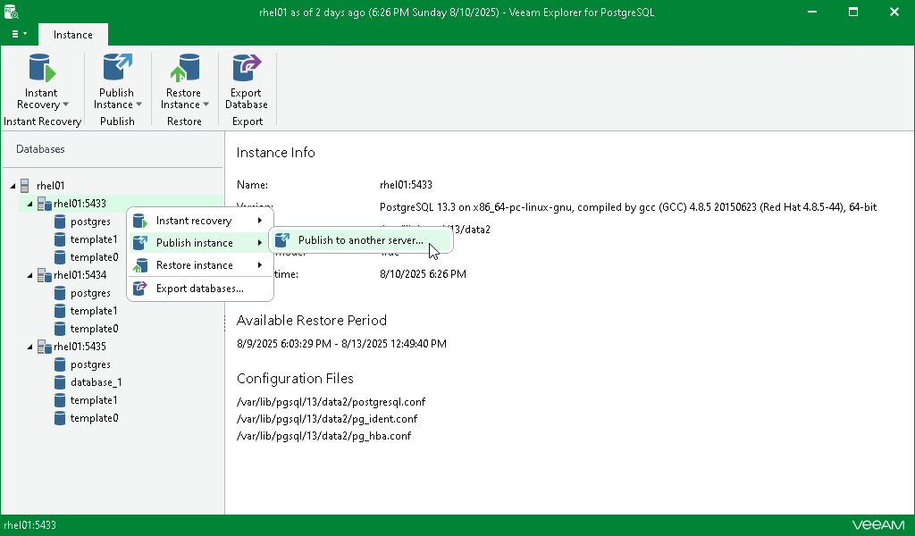 Step 1. Launch Publish Wizard To launch the Publish wizard, do the following:In the navigation pane, select a PostgreSQL instance you want to publish.On the Instance tab, select Publish Instance > Publish to another server.Alternatively, you can right-click an instance and select Publish Instance > Publish to another server.