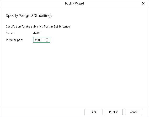 Step 4. Specify PostgreSQL Settings At this step of the wizard, specify a free PostgreSQL instance port in the Instance port field and click Publish.The specified port must be free. If the port is occupied, Veeam Explorer for PostgreSQL will display an error.