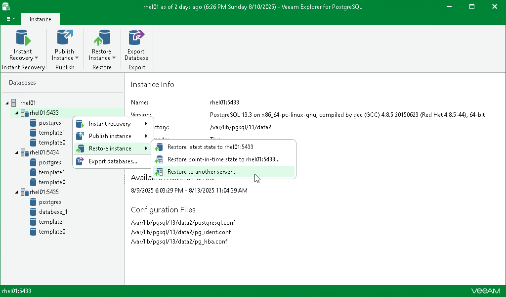 Alternatively, you can right-click an instance and select Restore Instances > Restore to another server.