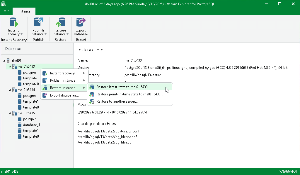 - In the navigation pane, select a PostgreSQL instance you want to restore.