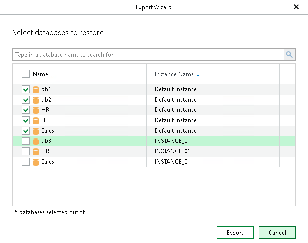 At this step of the wizard, select the necessary databases and click Export.
