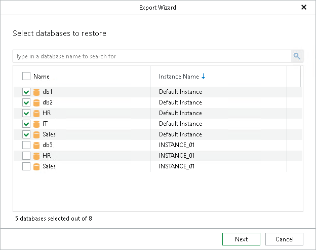 To quickly find the necessary databases, use the search field or sort the databases by name. If the databases belong to multiple instances, you can also sort the databases by instance name.