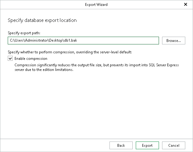 Step 4. Specify Export Location At this step of the wizard, specify the path to the destination directory and click Export.You can select Enable compression check box to reduce the output file size.NoteCompression is unavailable if the staging SQL server runs any Express Edition of Microsoft SQL Server.