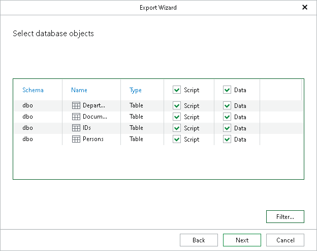Step 4. Select Database Objects At this step of the wizard, select database objects to restore.To display only specific objects, click Filter and select an object type you want to be shown in the list.