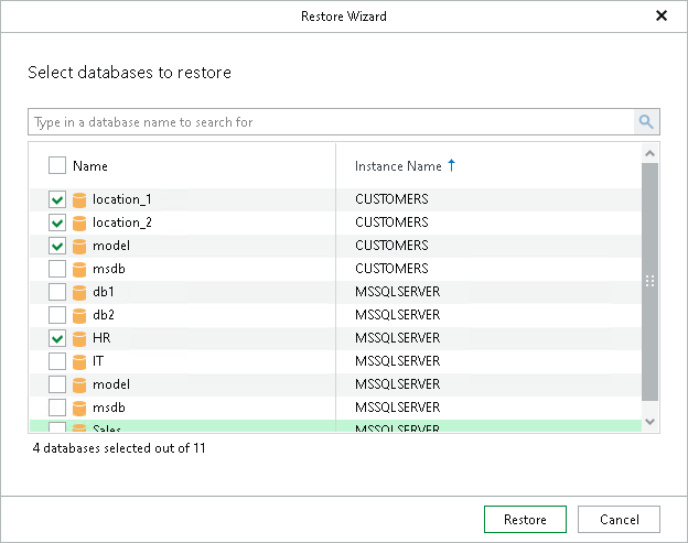 To quickly find the necessary databases, use the search field or sort the databases by name. If the databases belong to multiple instances, you can also sort the databases by instance name.