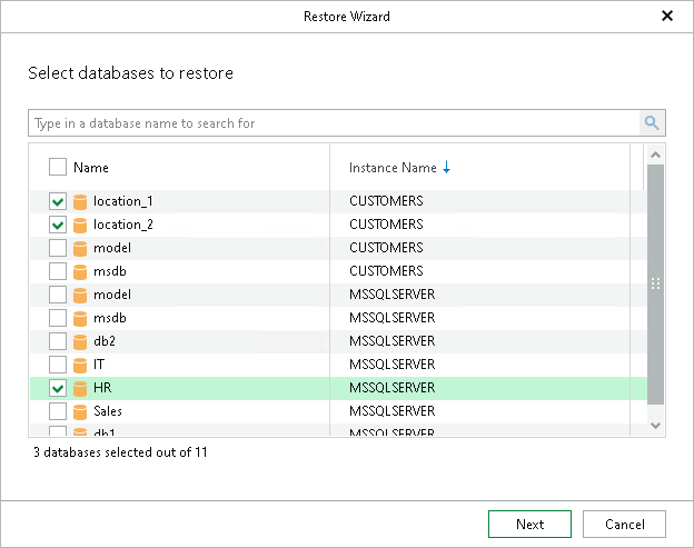To quickly find the necessary databases, use the search field or sort the databases by name. If the databases belong to multiple instances, you can also sort the databases by instance name.