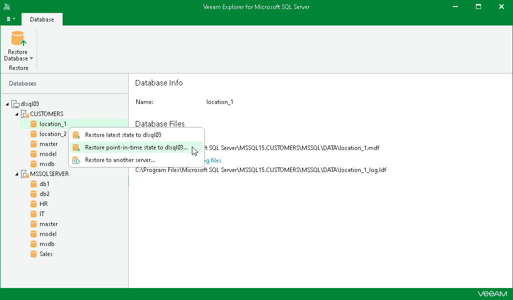 Step 1. Launching Restore Wizard To launch the Restore wizard, do the following:In the navigation pane, select a database.On the Database tab, select Restore Database > Restore point-in-time state to <original_location>.Alternatively, you can right-click a database and select Restore point-in-time state to <original_location>.