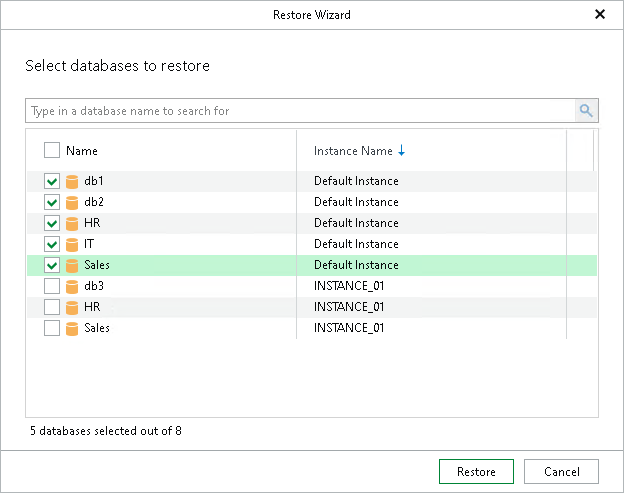To quickly find the necessary databases, use the search field or sort the databases by name. If the databases belong to multiple instances, you can also sort the databases by instance name.