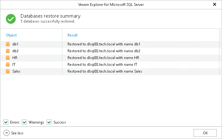 At the Databases restore summary step, click See more to expand the window and review details of the restore operation.