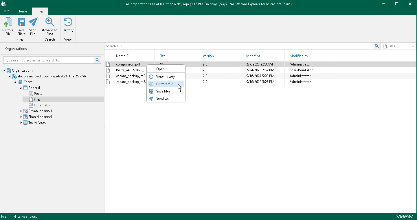- In the navigation pane, expand a channel whose files you want to restore, right-click Files and select Restore files.