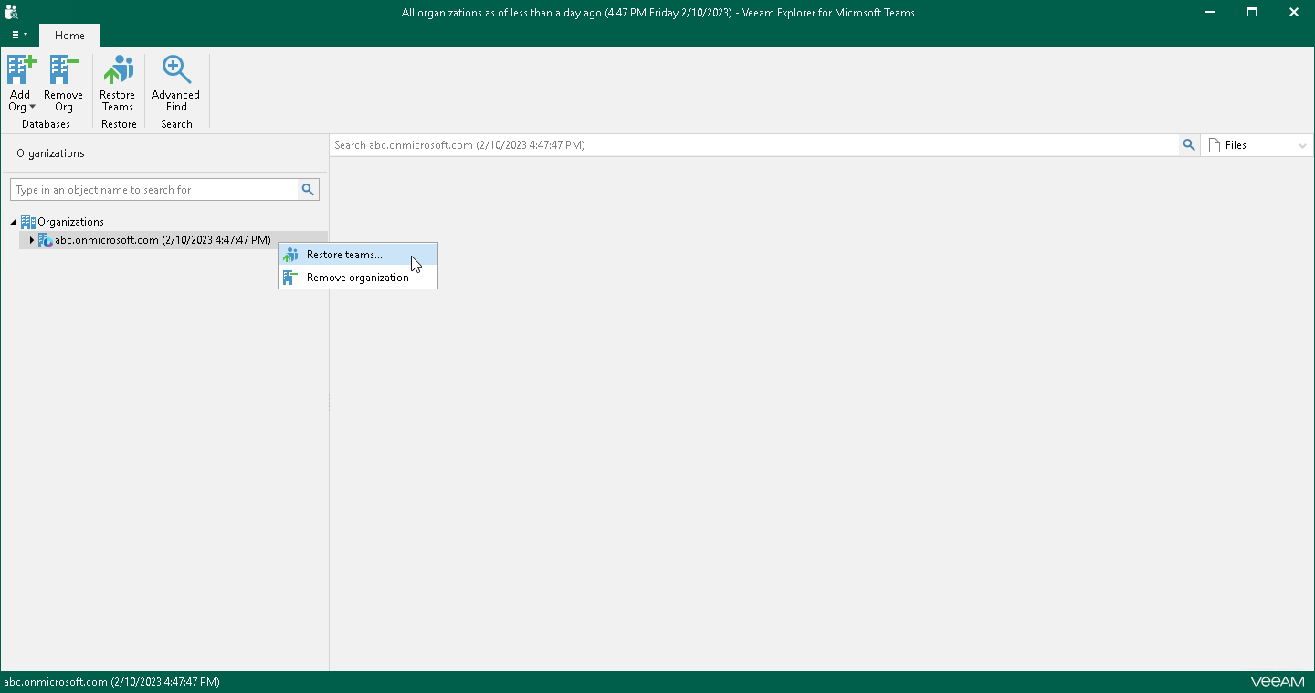 - In the navigation pane, right-click an organization whose teams you want to restore and select Restore teams.