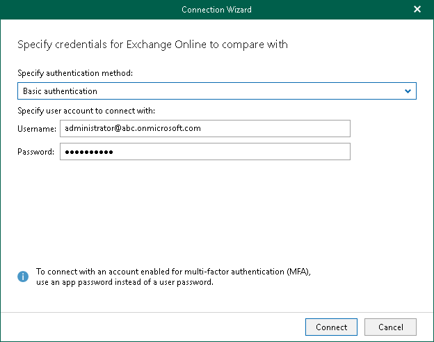 - Enter credentials to connect to the Exchange organization and click Connect.