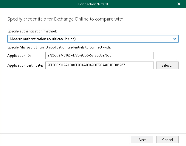 By default, Veeam Explorer for Microsoft Exchange populates this field with the identification number of the application that was used during a backup session. If you want to use another application, make sure to grant this application required permissions. For more information, see the Microsoft Entra Application Permissions section of the Veeam Backup for Microsoft 365 User Guide.