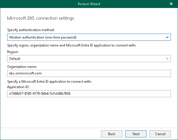 Modern authentication allows Veeam Backup for Microsoft 365 to use a Microsoft Entra application for data restore. Such an application is used to restore the specified mailbox, folder or item back to Microsoft 365 organizations with enabled multi-factor authentication (MFA). For more information, see the Adding Microsoft 365 Organizations section of the Veeam Backup for Microsoft 365 User Guide.