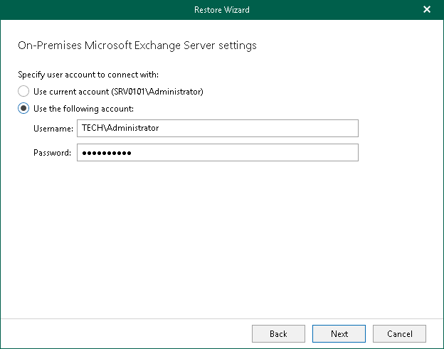 Step 3. Specify User Account At this step of the wizard, specify an account that you want to use to connect to the Exchange server in your domain.