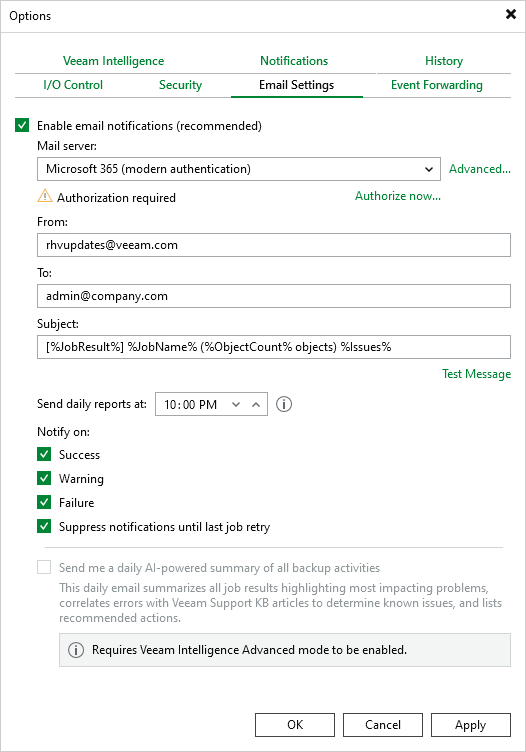 You can specify email notification settings for automated delivery of job results. To connect an SMTP server that will be used for sending email notifications: